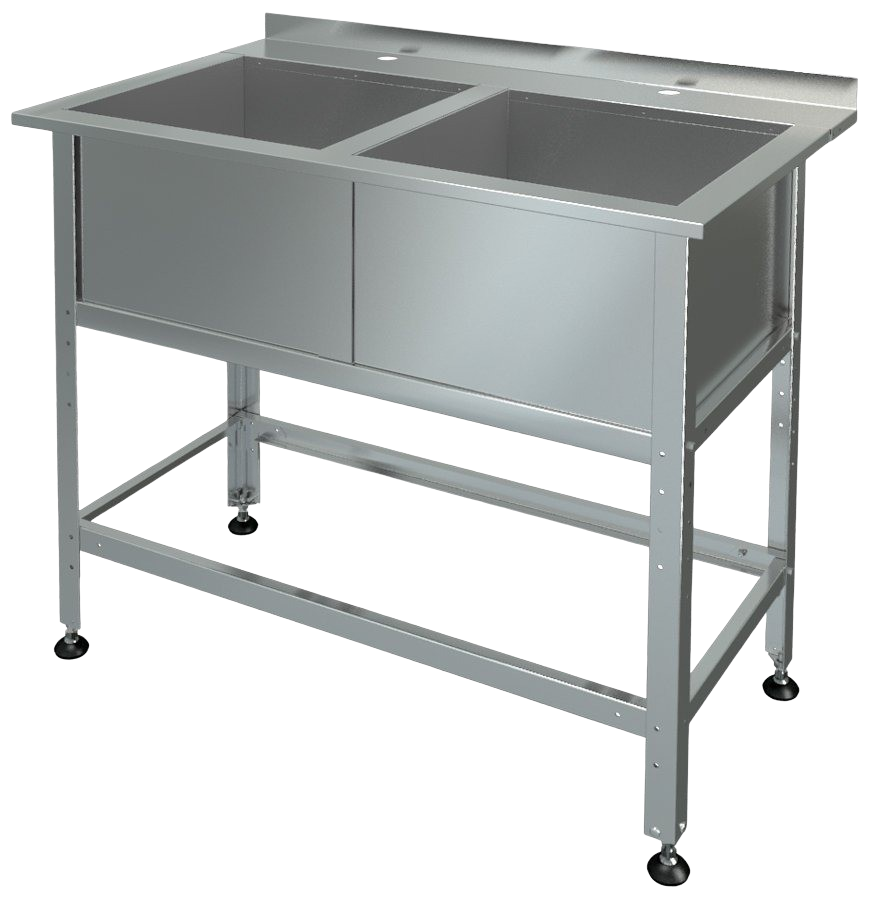Ножки с регулируемыми опорами — оцинкованная / нерж. сталь, выполнены из уголка 40х40мм. t=1,0 мм с подгибом краёв во внутрь. Каркас оцинкованная/ нерж. сталь t=1,0 мм. Ванна из нерж. сталь AISI 430 t=0,6 мм. (емкости длиной 1,35 и 1,55 из нерж. сталь AISI 430 t=0,8мм). В комплект входит гофросифон. На мойках имеются специальные борты с отверстиями под смеситель.