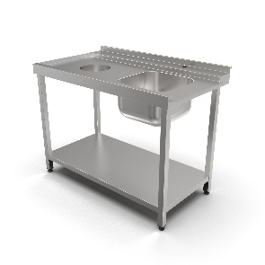Стол для посудомоечной машины входной (столешница — нерж. сталь. aisi 430, усиление ЛДСП, емкость 400х400х250, отверстие под смеситель, каркас сварной нерж. труба 40х40, борт, полка, отверстия для сбора отходов)