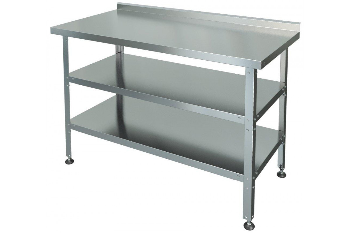 Ножки с регулируемыми опорами — оцинкованная / нерж. сталь t=1,0 мм, выполнены из уголка 40х40мм с подгибом краёв во внутрь. Столешница нерж. сталь, AISI 430 t=0,5 мм. усиление столешницы — ЛДСП (16мм). С нижней сплошной полкой.