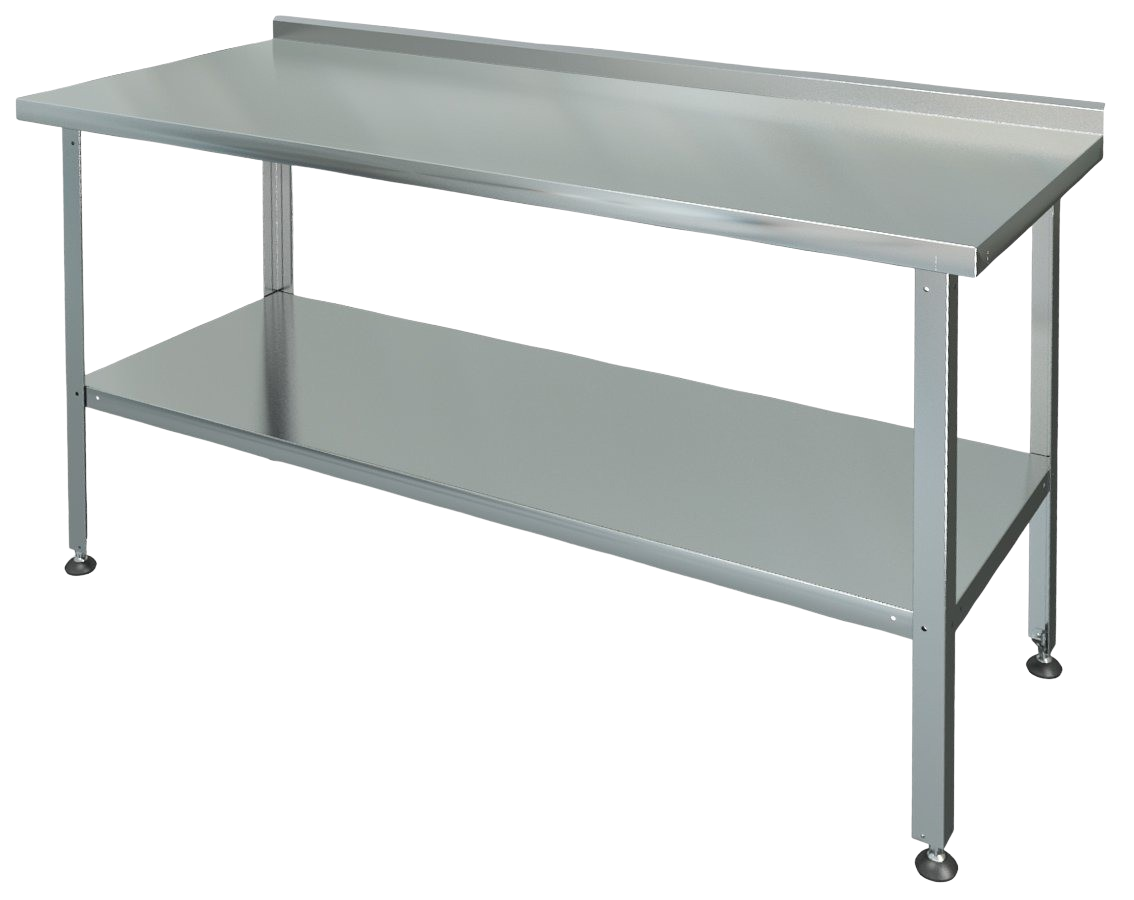 Ножки с регулируемыми опорами — оцинкованная / нерж. сталь t=1,0 мм, выполнены из уголка 40х40мм с подгибом краёв во внутрь. Столешница нерж. сталь, AISI 430 t=0,5 мм. усиление столешницы — ЛДСП (16мм). С нижней сплошной полкой.