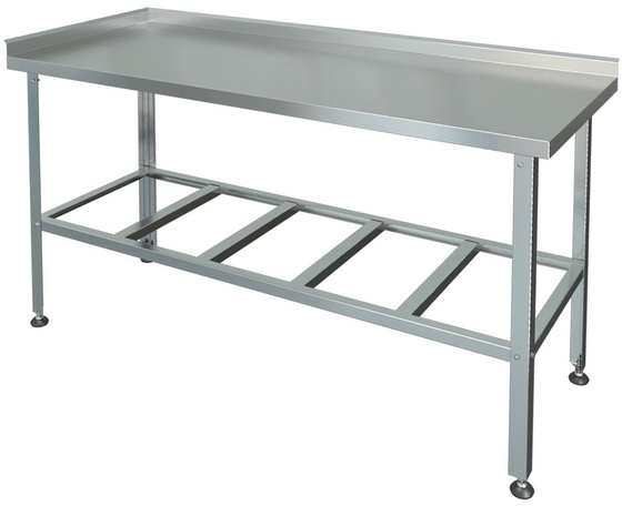 Ножки с регулируемыми опорами — оцинкованная / нерж. сталь t=1,0 мм, выполнены из уголка 40х40мм с подгибом краёв во внутрь. Столешница нерж. сталь, AISI 430 t=0,5 мм. усиление столешницы — ЛДСП (16мм). С нижней сплошной полкой.