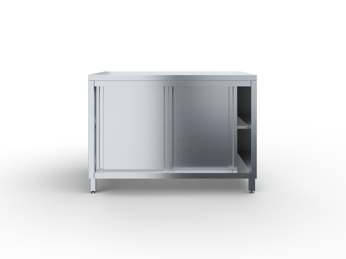 Стол-тумба с дверьми-купе со столешницей из нержавеющей стали марки AISI 430 толщиной 0,8мм. Столешница усилена подложкой из фанеры толщиной 16 мм. Сплошная полка и из нержавеющей стали марки AISI 430 толщиной 0,8мм. Регулируемые опоры. У стола имеется съёмный борт из нержавеющей стали марки AISI 430 толщиной 0,8мм. Стол поставляется в собранном виде. В упакованном виде изделие имеет габариты 1000х700х850 мм.