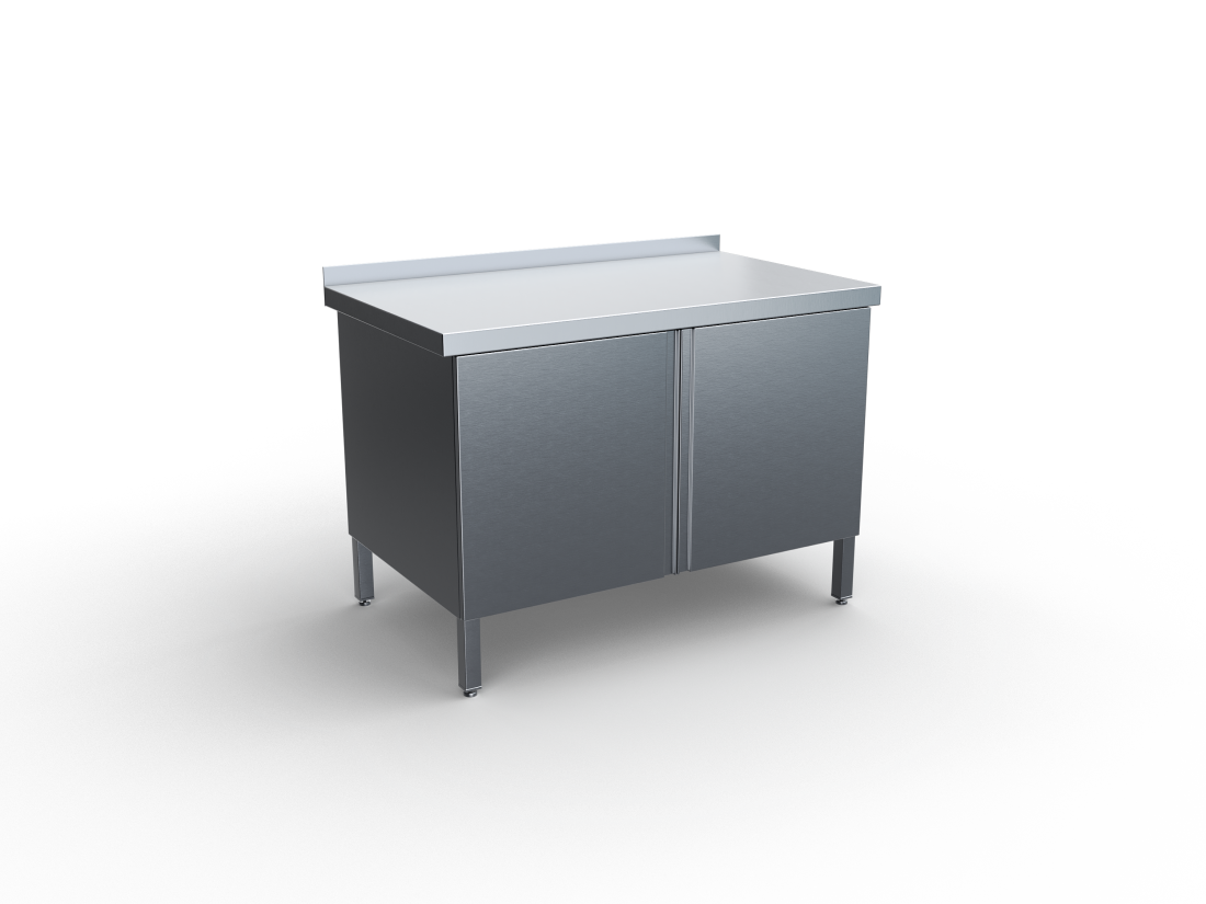 Стол-тумба с распашными дверьми со столешницей из нержавеющей стали марки AISI 430 толщиной 0,8мм. Столешница усилена подложкой из фанеры толщиной 16 мм. Сплошная полка и из нержавеющей стали марки AISI 430 толщиной 0,8мм. Регулируемые опоры. У стола имеется съёмный борт из нержавеющей стали марки AISI 430 толщиной 0,8мм. Стол поставляется в собранном виде. В упакованном виде изделие имеет габариты 700х700х850 мм.
