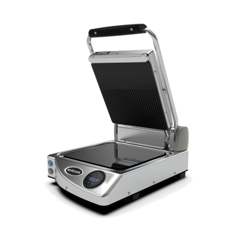 Гриль контактный, электрический, настольный, серии SpidoGlass, оснащён корпусом из нержавеющей стали, 1 зоной нагрева, верхней рифленой и нижней гладкой рабочими поверхностями размером 250х250мм из чёрной стеклокермики, электронной панелью управления, таймером, сигналом окончания цикла приготовления, настраиваемыми программами, светодиодной подсветкой, съемным жиросборником. Верхняя рабочая поверхность снабжена автоматической балансировкой. Стеклокерамические поверхности быстро достигают заданной температуры благодаря инфракрасным нагревателям и способствуют быстрой очистке при уходе, благодаря чему широко используются для быстрого разогрева тостового хлеба, бутербродов и приготовления мяса, рыбы, овощей. Гриль имеет рабочий термостат до +350C, предохранительный термостат.